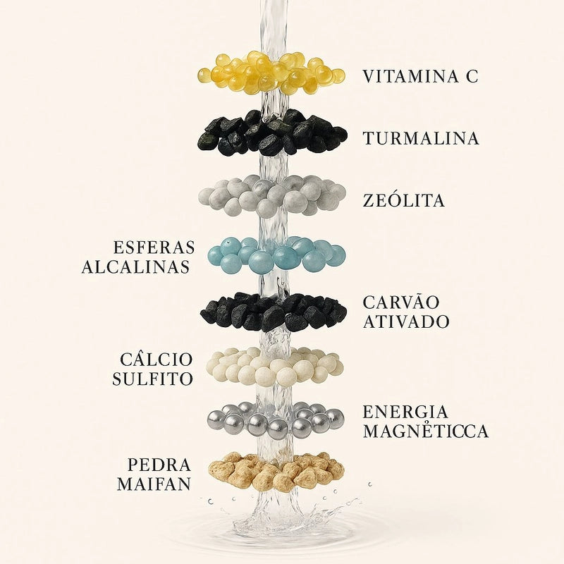 15 camadas de filtração trabalham juntas para reduzir cloro e reter partículas da tubulação antes da água tocar você.